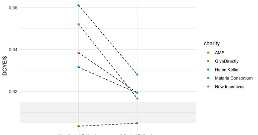These estimates use a simple averaging for each Top Charity across all regions they work. This is very unlikely to be what GiveWell actually uses to make funding decisions. If the estimates were broken down into charity-country pairings, for example, we would probably find uncertainty quantification to be even more consequential, because more rankings would be changed.